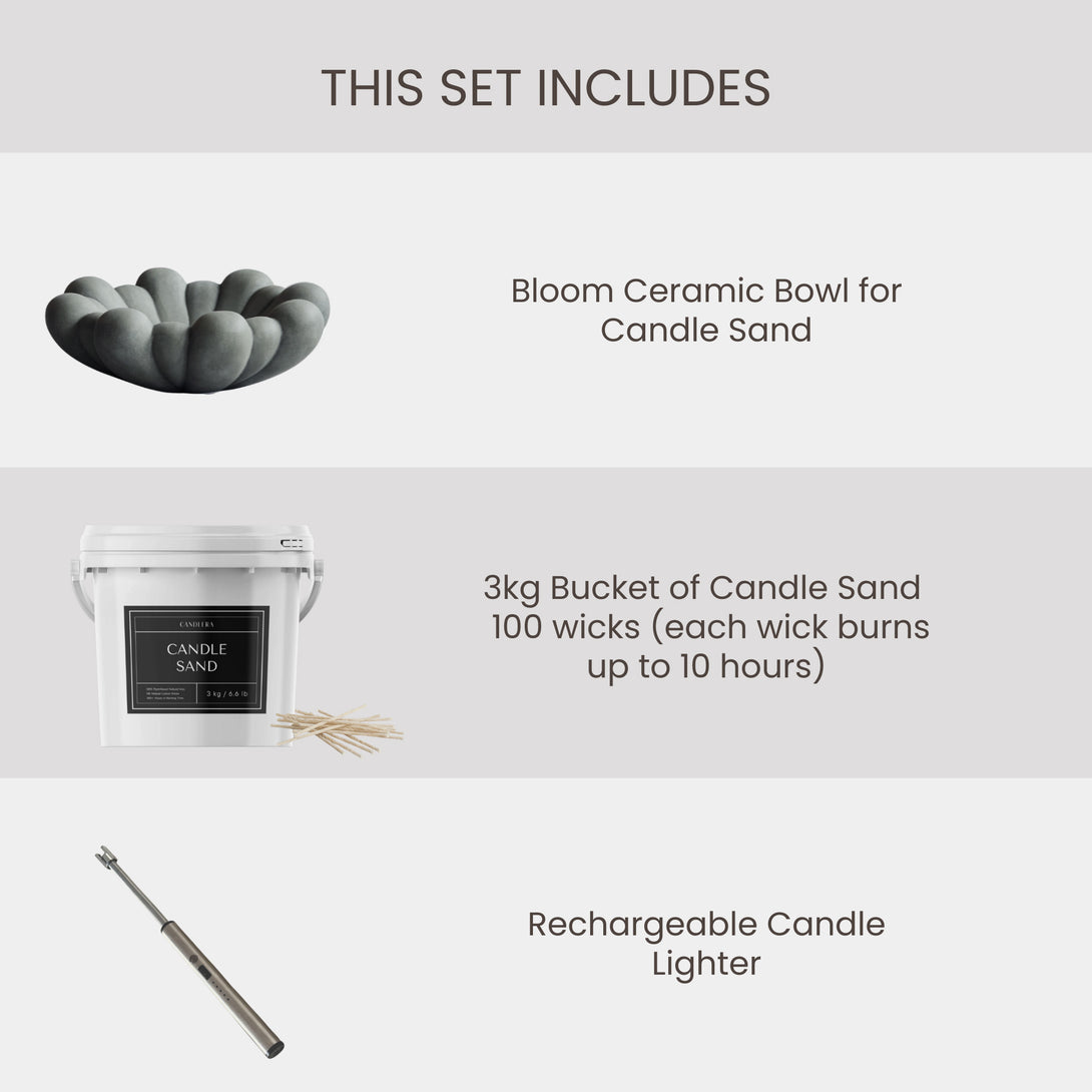 A: Each bundle is unique. The contents are carefully curated and may vary — that’s what makes each one special. You’ll always receive a mix of our most-loved Candle Sand, designer bowls, and accessories.