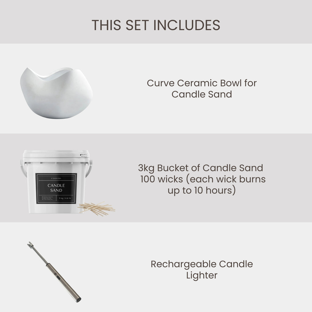A: Each bundle is unique. The contents are carefully curated and may vary — that’s what makes each one special. You’ll always receive a mix of our most-loved Candle Sand, designer bowls, and accessories.